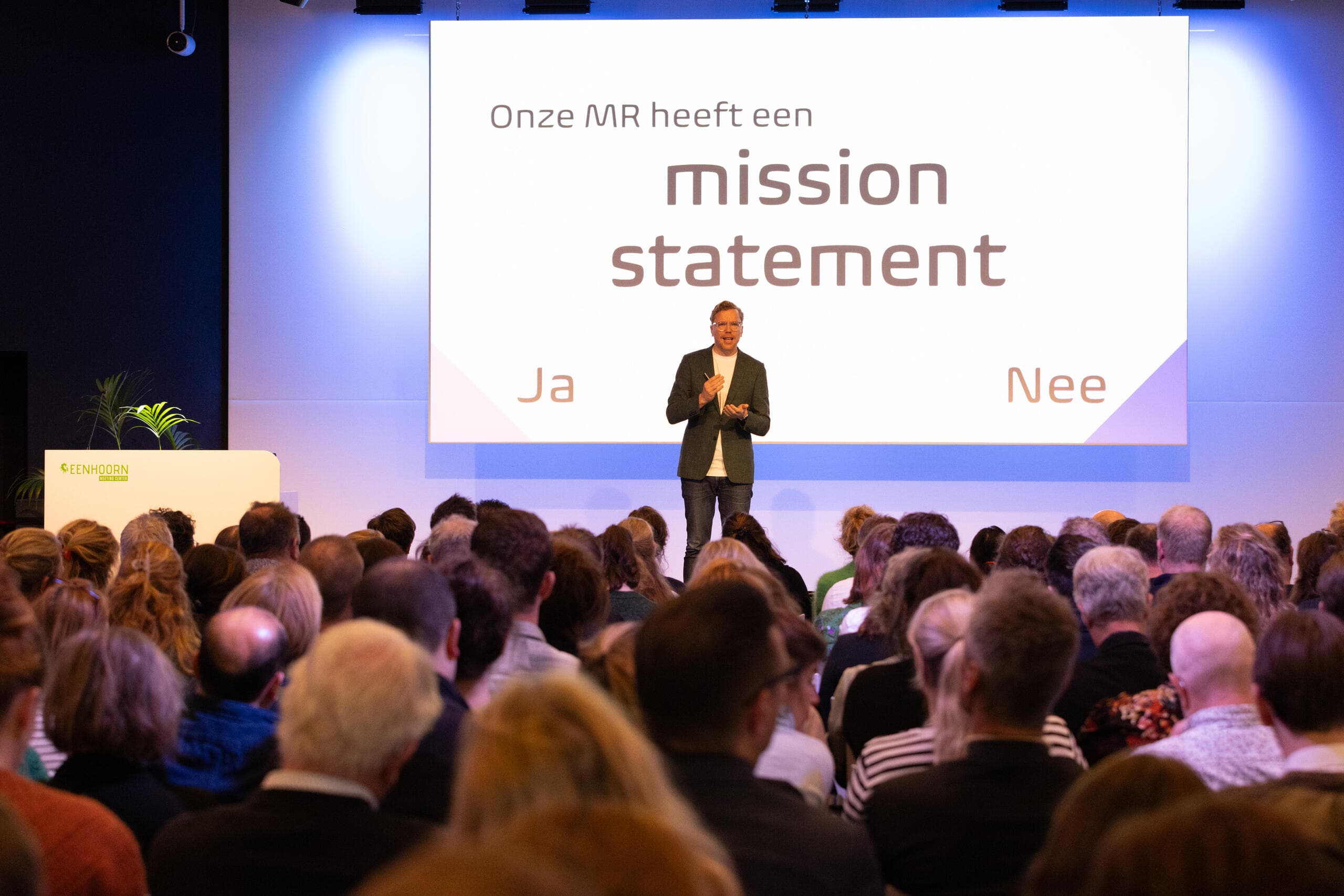 Keynote spreker Jitze Reeder inspireerde de zaal met ambitieus medezeggenschap. Hoe smeed je van een stel individuen een eenheid? En zorg je dat je samen verder komt? Hij benadrukte dat je vanuit verschillende ambities en invalshoeken elkaar kunt aanvullen en dat het goed is om hierbij ook naar overeenkomsten te zoeken. Bij ambitieus medezeggenschap is communicatie een sleutelwoord!